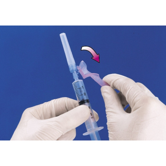 L’aiguille souillée peut être recouverte de façon uni-manuelle, immédiatement après avoir dépiqué, en pivotant d’un doigt (pouce ou index) le dispositif de sécurité intégré à l’aiguille. Le système de sécurité est verrouillé de façon irréversible dès l’obtention d’un « clic ». La surface ergonomique anti-dérapante du poussoir facilite et sécurise le geste.
