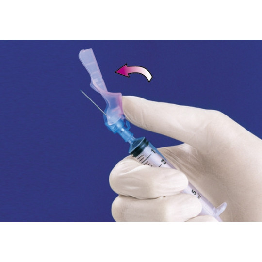 L’aiguille souillée peut être recouverte de façon uni-manuelle, immédiatement après avoir dépiqué, en pivotant d’un doigt (pouce ou index) le dispositif de sécurité intégré à l’aiguille. Le système de sécurité est verrouillé de façon irréversible dès l’obtention d’un « clic ». La surface ergonomique anti-dérapante du poussoir facilite et sécurise le geste.