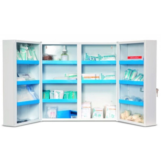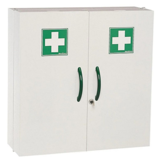 L'armoire à pharmacie murale est équipées de nombreuses étagères et de deux portes. Idéale pour une entreprise.