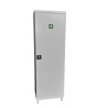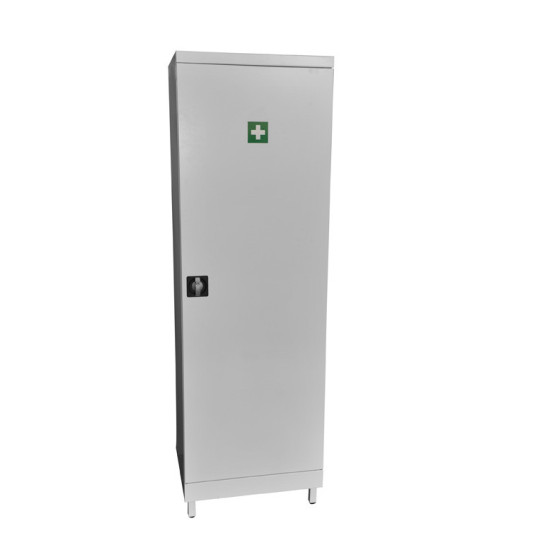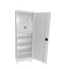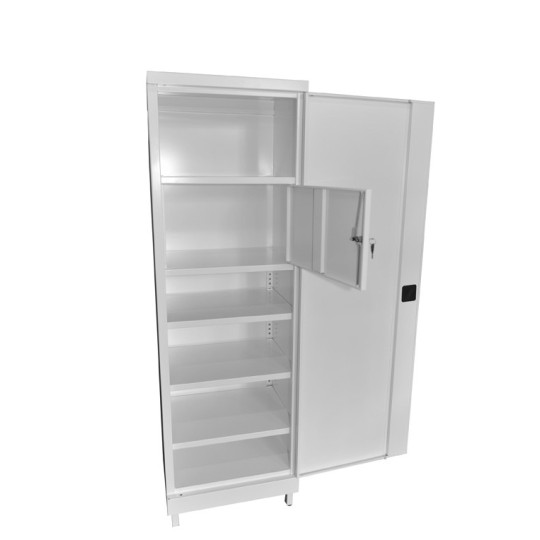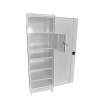 Armoire médicale pour pharmacie équipée d'une porte battante avec une serrure 2 points de fixations et de trois étagères blanches sur la partie basse de l'armoire.