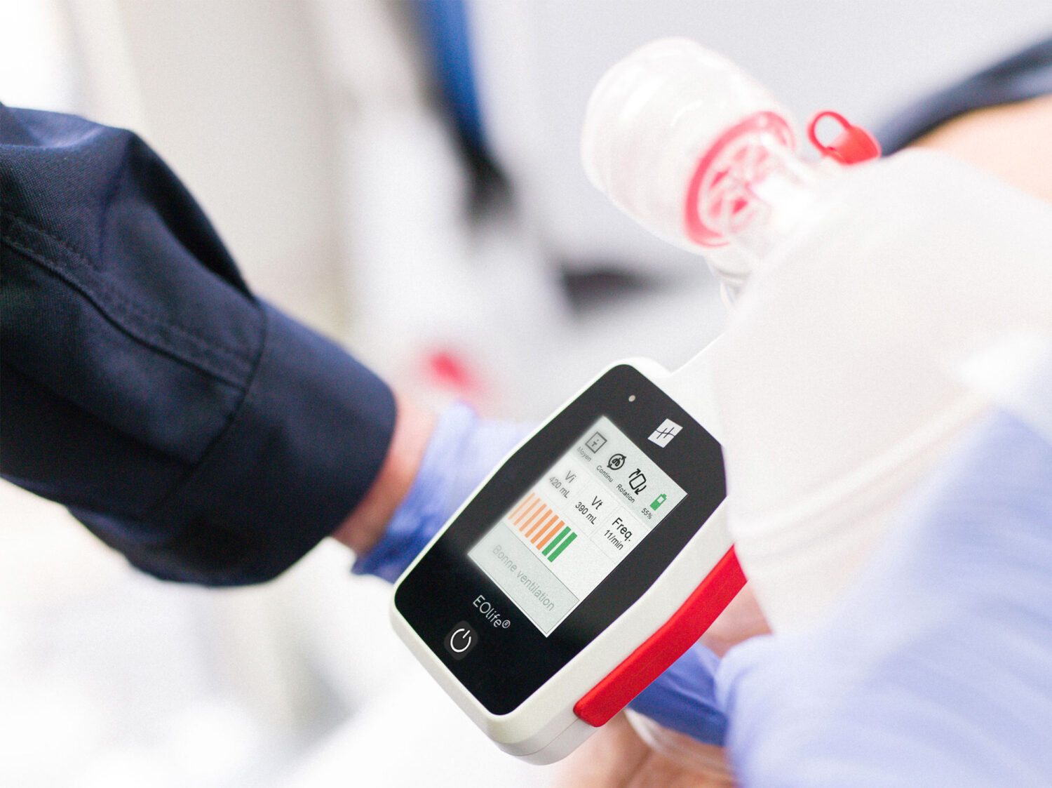 « Seulement avec le BAVU, il est difficile de se rendre compte qu’on est mal positionné. Avec l’appareil (EOlife X), les équipes sont alertées. Elles ont alors l’instinct de rebasculer la tête et de repositionner le masque. Ce sont des petits détails, mais c’est ce qui fait toute la différence d’être assisté ».