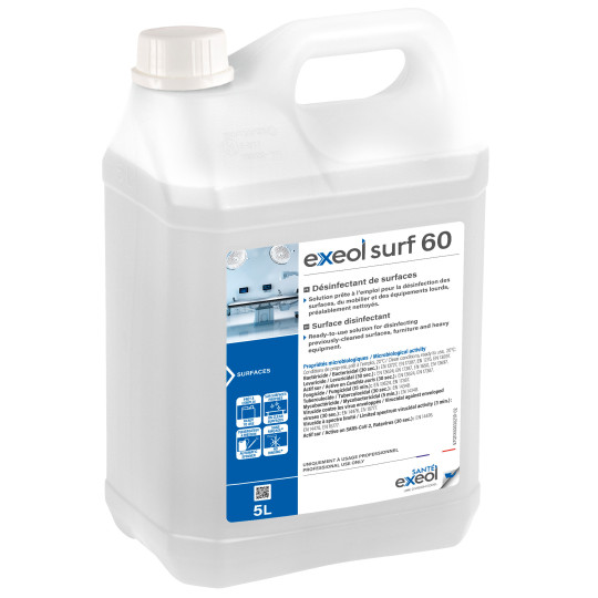 Exeol Surf 60 est un désinfectant de surfaces prêt à l'emploi, idéal pour le mobilier et équipements lourds préalablement nettoyés. La solution désinfectante L'Exeol Surf 60 est sans parfum avec un pH 6-7.