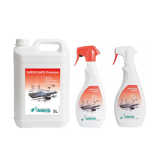 La solution Anios Surfa'Safe Premium nettoie et désinfecte toutes les surfaces. Convient pour les revêtements de table d'examen et d'ausculation, fauteuils, plans de travail ... Ce produit combine nettoyage et désinfection en une seule opération.