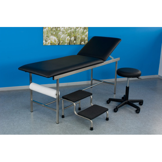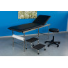 L'ensemble mobilier médical est composé d'un divan d'examen à hauteur fixe, d'un tabouret à roulettes assorti à la sellerie du divan et d'un marchepied deux marches.