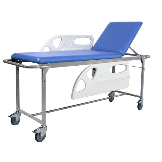 Table d'examen brancard deux parties Ecomax Ugence de la marque Carina sur roulettes avec freins. Equipé de poignées de poussée et d'une paire de barrières escamotables