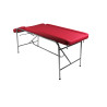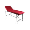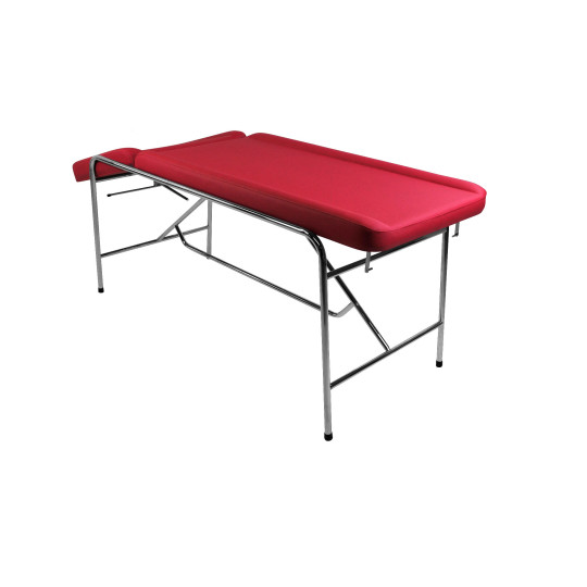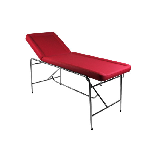 Table d'examen à hauteur fixe de 80 cm avec piètement chromé et sellerie confortable de 6 cm d'épaisseur avec bourrelets latéraux. Le dossier est réglable par autoblocage mécanique.
