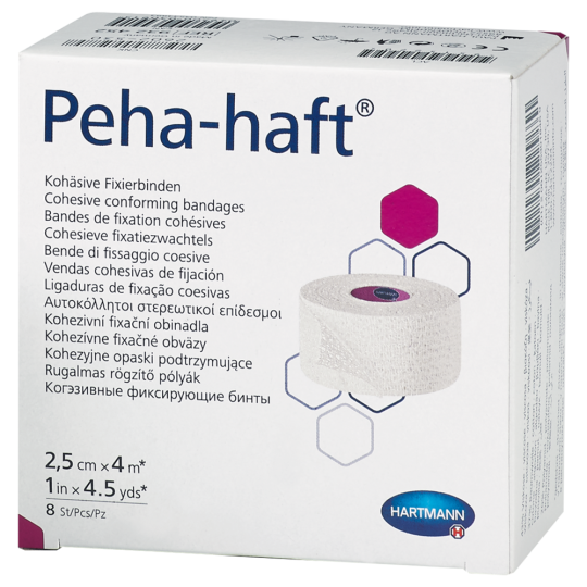 La bande cohésive Peha-Haft Hartmann est disponible en quatre tailles différentes : 6 cm x 20 m, 8 cm x 20 m, 10 cm x 20 m, 6 cm x 4 m, 8 cm x 4 m et 2.5 cm x 4 m.