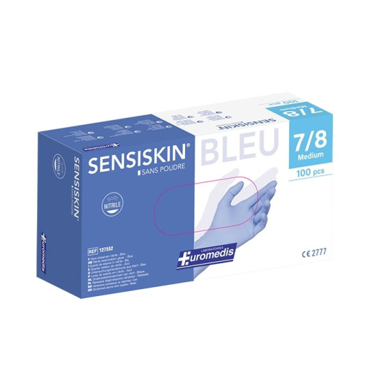 Les gants d'examen en nitrile sans poudre des Laboratoires EUROMEDIS sont de couleur bleu et offre une bonne résistance à la déchirure. Ce gant de protection à usage unique d'une dimension de 240 mm est doté d'un bord roulé et d'une manchette.  Les gants SENSISKIN peuvent être utilisés pour les décontaminations, le nettoyage et pour la manipulation d'agents cytostatiques (haute résistance aux solvants). Adaptés aux milieux alimentaires.
