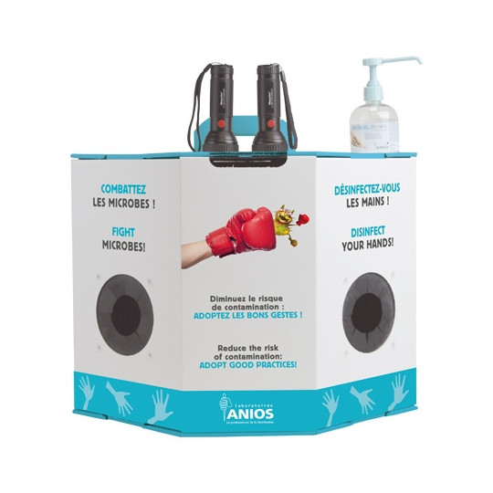 A l'aide d'un témoin fluorescent contenu dans un produit hydroalcoolique, l'utilisateur visualise avec le formateur la qualité de la friction.