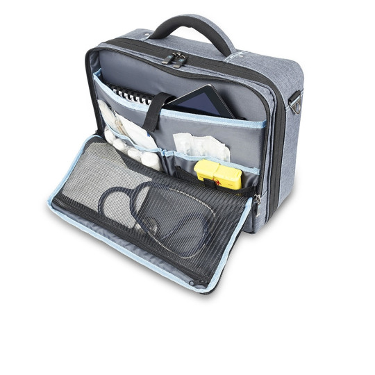 La première poche principale est composée d'un espace de dimension suffisante pour votre ordinateur ou tablette, de deux pochettes, des rangements par élastiques, d'une grande poche filet et d'un collecteur de déchets médicaux.