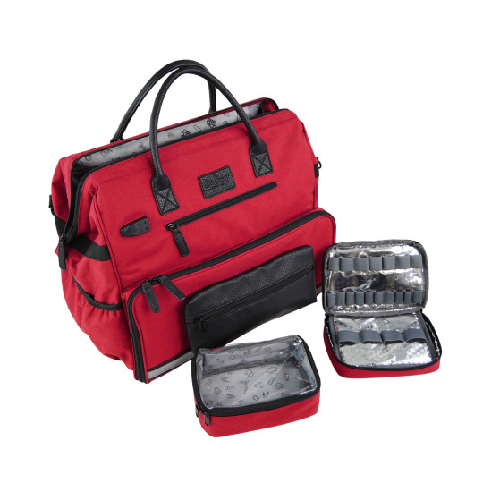 L'espace principal à grande ouverture comprend six poches, deux séparateurs amovibles velcro et compartiment matelassé pour l'ordinateur portable. Cette espace comprend aussi deux compartiments détachables (avec velcro) : un transparent et un ampoulier isotherme incluant une poche de gel froid réutilisable.