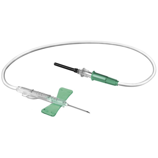 Unité de prélèvement sanguin stérile avec aiguille à ailettes, système de sécurité et adaptateur luer pré-assemblé. Sans latex, sans phtalate.