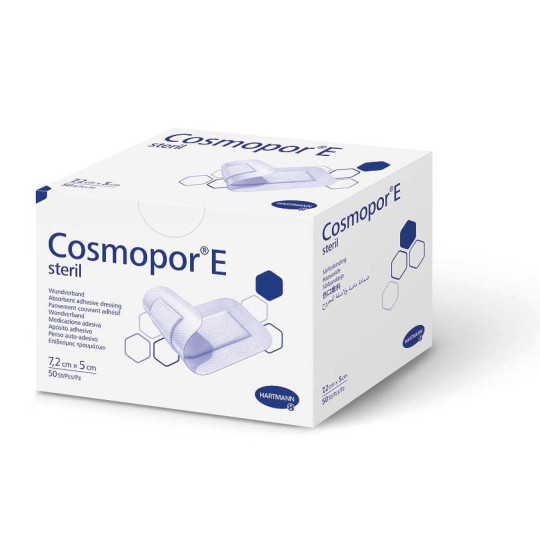 Cosmopor E de la marque Hartmann est un pansement adhésif stérile muni d'un coussin absorbant non adhérent à la plaie sur support non tissé très doux. Recommandé pour le soin des plaies post-opératoires et des plaies modérément exsudatives et pour le recouvrement des plaies superficielles en général.