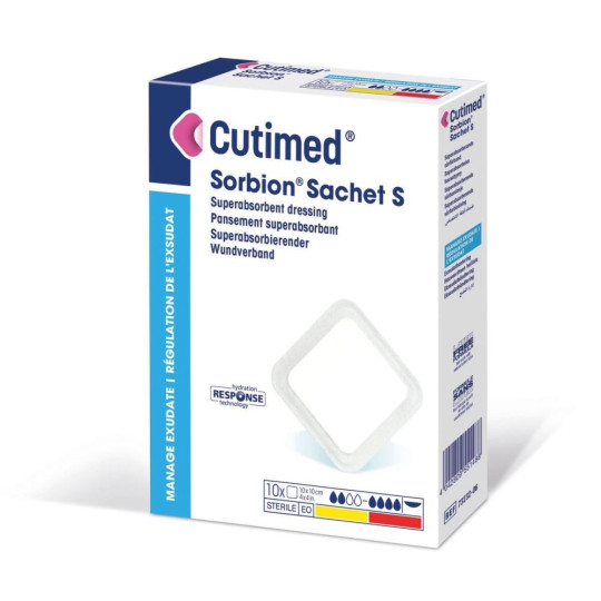 Pansement superabsorbant hydro-actif stérile conçu pour toute plaie fortement exsudative, fibrineuse ou non, telles que ulcère des membres inférieurs, escarre, plaie cancéreuse ulcérée, brûlure exsudative (2e degré superficiel).