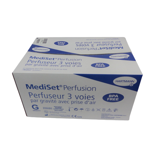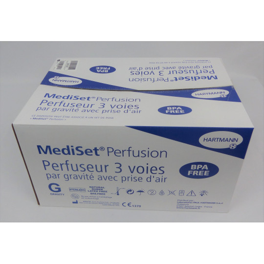 Mediset perfuseur 3 voies par gravité avec prise d'air destiné à l'administration par gravité d'une solution injectable à un patient en respectant un débit défini par le personnel soignant. A utiliser sur poche ou flacon.