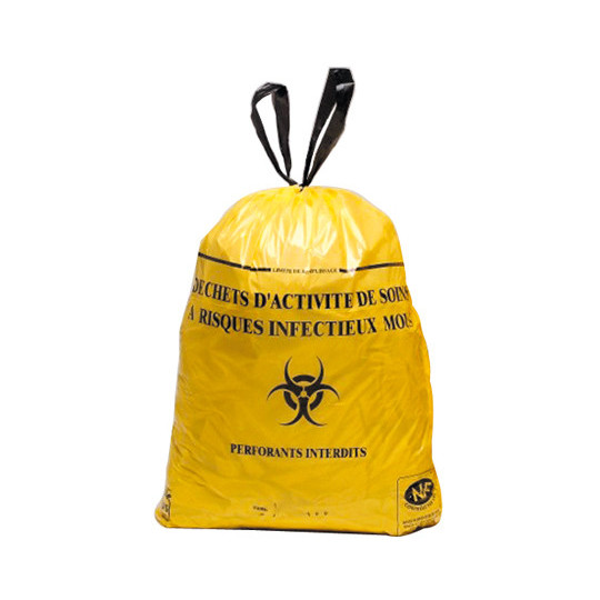 C'est un sac de couleur jaune qui convient d’habitude pour les champs opératoires usagés, les compresses souillées, ou encore les vêtements à usage unique. Les déchets médicaux qui y sont jetés ne sont jamais coupants, encore moins perforants. Le sac est en polyéthylène avec liens coulissants afin d’offrir une fermeture plus facile et plus sécuriser. Il est proposé en plusieurs dimensions. Il peut également devenir très utile pour certains patients qui se retrouvent en autotraitement. Le sac porte l’intitulé « Déchets à risques infectieux mous », ainsi que le pictogramme « risque biologique ».