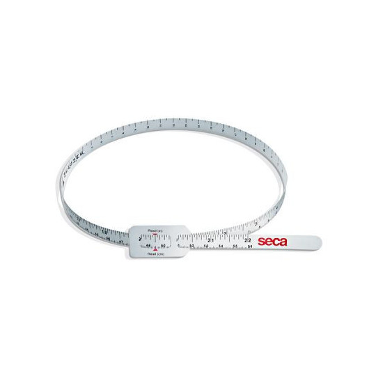 Ruban de mesure du périmètre crânien des nourrissons et enfants en bas âge. Ce ruban en téflon inextensible à double graduation permet de déterminer aussi bien le périmètre crânien (face avant) que la symétrie faciale (face arrière du ruban).