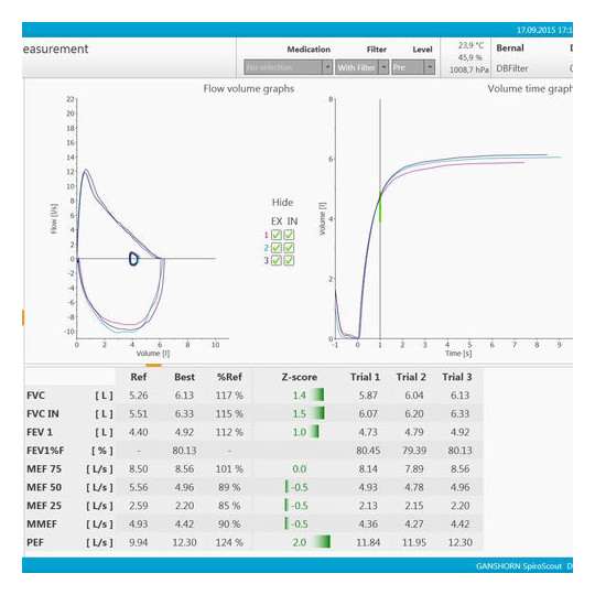 Les mesures sont effectuées à l'aide du capteur de spirométrie ultrasonique SpiroScout qui ne nécessite ni temps de chauffage, ni protocole de vérification.